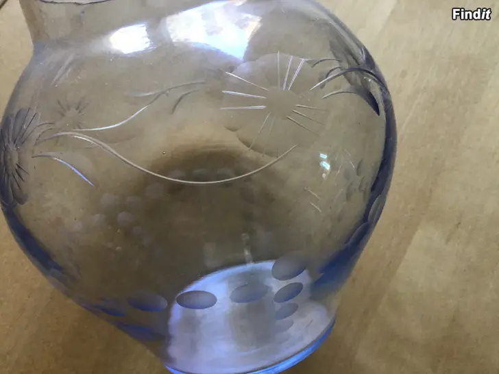 En 100-årig liten vas i isblå glas med slipade blommor. Hel.