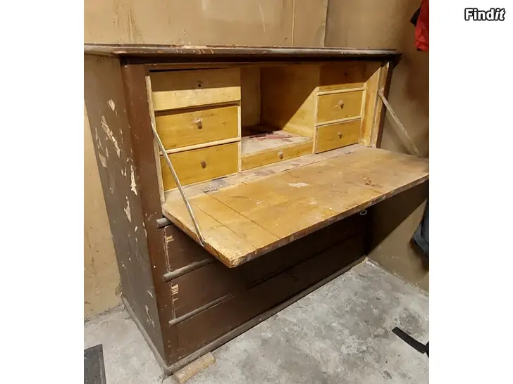 Säljes klaffbyrå från 1800 talet. För den som vill restaurera finns småfix. Mått längd 117 höjd 105 djup 48