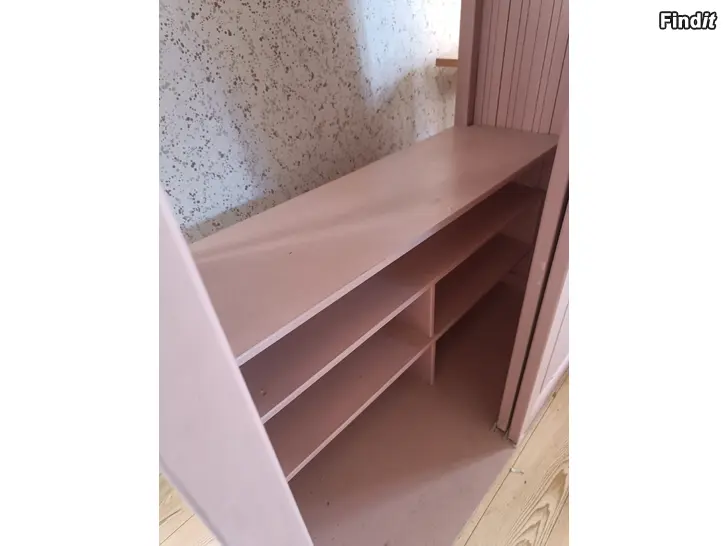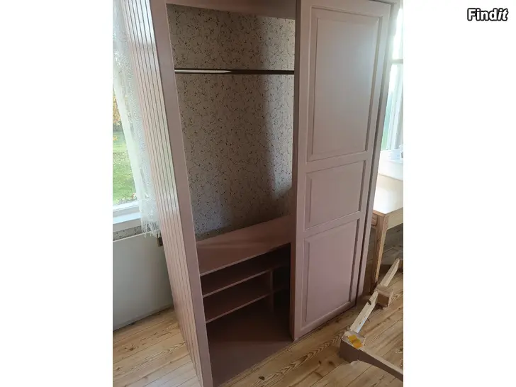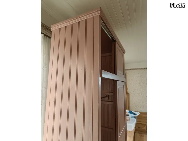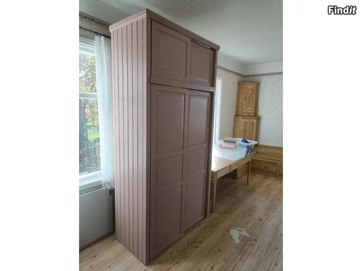 Stort gediget klädskåp i trä med skjutdörrar. Gammalrosa färg. Bredd 120 cm, höjd 248 +13 cm sockel/ben, djup 60 cm. Hämtas från Bäckliden i Närpes.