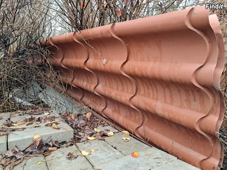 Takplåtar till salu, fotot visar var plåtarna har varit. Totalt 10 st, några av dem kapade vid takutsprånget. De flesta är raka plåtar. Plåtarna byttes ut på försäkringsbolagets bekostnad för hela området när en grannes träd föll på husets gavel och två plåtar skadades. Om bara de två yttersta plåtarna hade bytts ut hade färgen på de nya plåtarnas färgton skilt sig från de andra plåtarna och det accepterade vi inte, så alla plåtar byttes ut. Alla plåtar utom de skadade togs tillvara. Plåtarnas färg enligt bild. Längden på de långa plåtarna är 6,50 m och bredden är standard 110 cm. 12 mindre taknocksplåtar i olika längder, totalt för hela längden ca 15 m. Alla plåtar säljs som ett helt paket. Säljs mot bud. Ring för mer info. Plåtarna finns till påseende vid Kyrkbacken i Karleby.