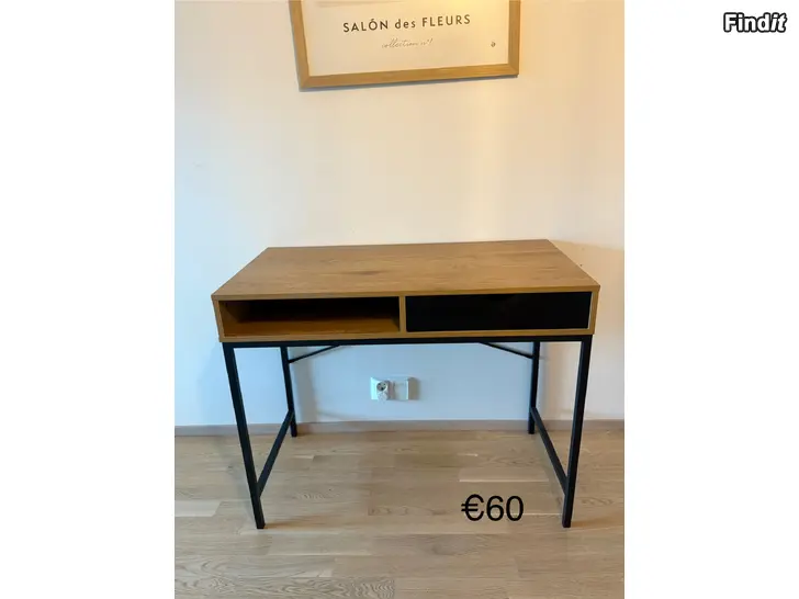 Modernt och stabilt skrivbord med metallben och träskiva i fin finish. Har en praktisk låda och hylla för förvaring. Passar perfekt som skrivbord, datorbord eller arbetsplats hemma. Mycket bra skick!