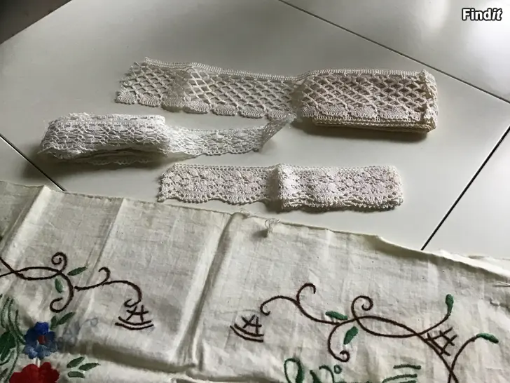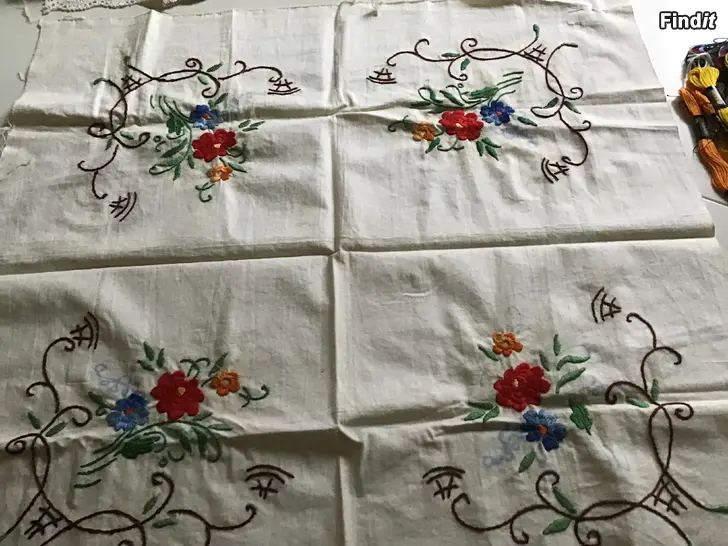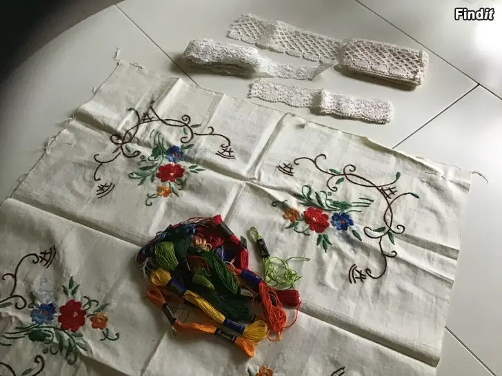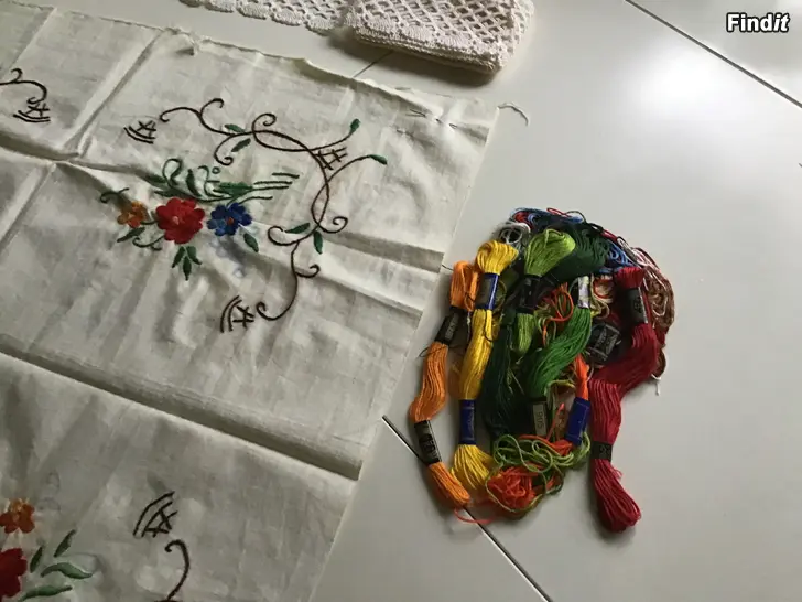 En duk 60x60 cm som är broderad till ca 70-80 procent Är du intresserad av att färdigställa duken och behålla den? Broderi garn och spetsar enligt bilder. Pris ? Vänligen ta kontakt ifall intresse finns. Se även mina övriga annonser