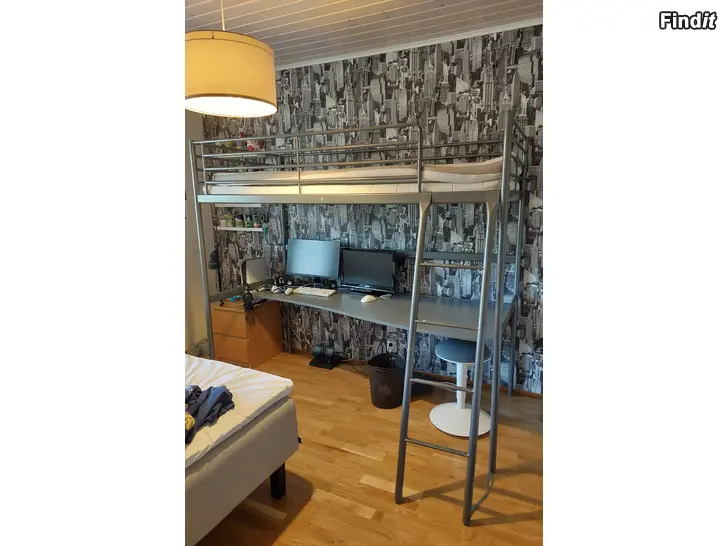 Säljes loftsäng med tillhörande skrivbord. Går att fästa i väggen. Praktisk helhet till pojk eller flickrummet. Färdigt nedmonterad. Säljes utan madrass. Finns i Maxmo.