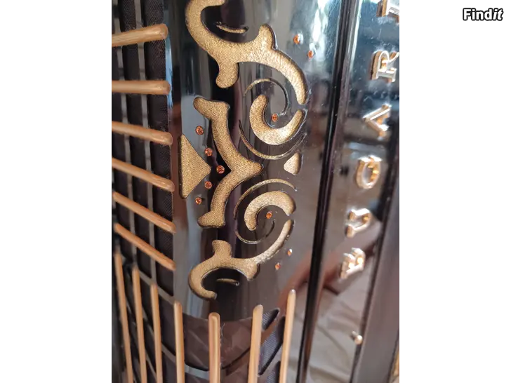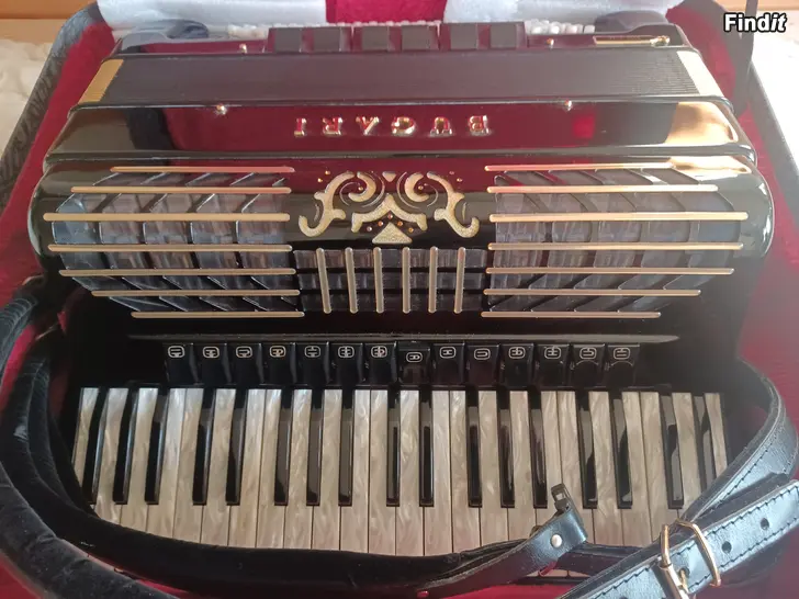 Dragspel av märket Bugari 4kör med cassotto. 41/120. Diskanten har 14 register, basen har 9. Modellen är Gold plus och har guldgul färg på bälgen. Har köpts ny och har använts varsamt allt original. Tillverkad i Italien väldigt fint skick.