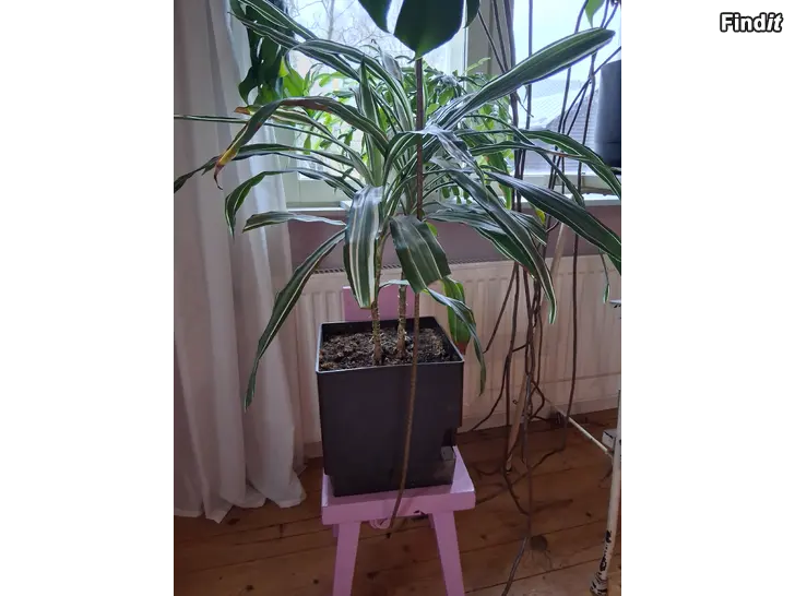 Isohko hyväkuntoinen traakkipuu altakasteluruukun kera. Korkeus noin 70cm ruukkuineen. Nouto Palosaarelta.
