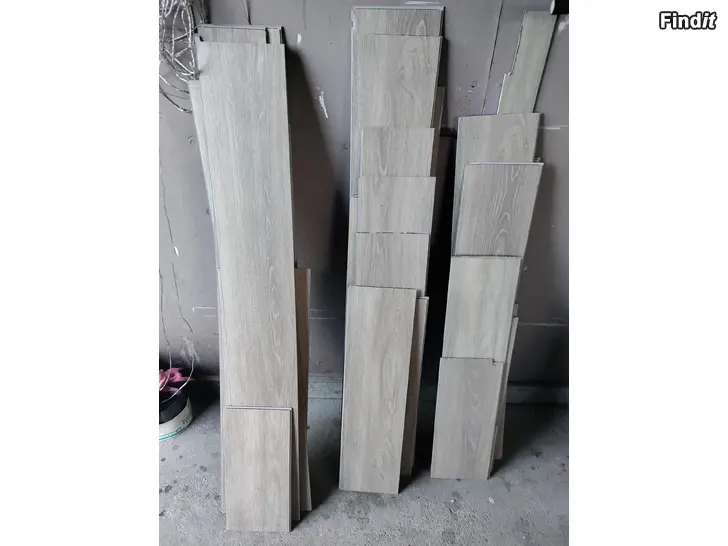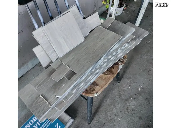Oanvända golvvinylplankor. Lagda en gång, och borttagna. Mått på plankorna 17,5 cm x 122 cm. Totalt täcker de 5,7 kvadratmeter golvyta. Massor med extra bitar med på köpet. Nypris 260€!