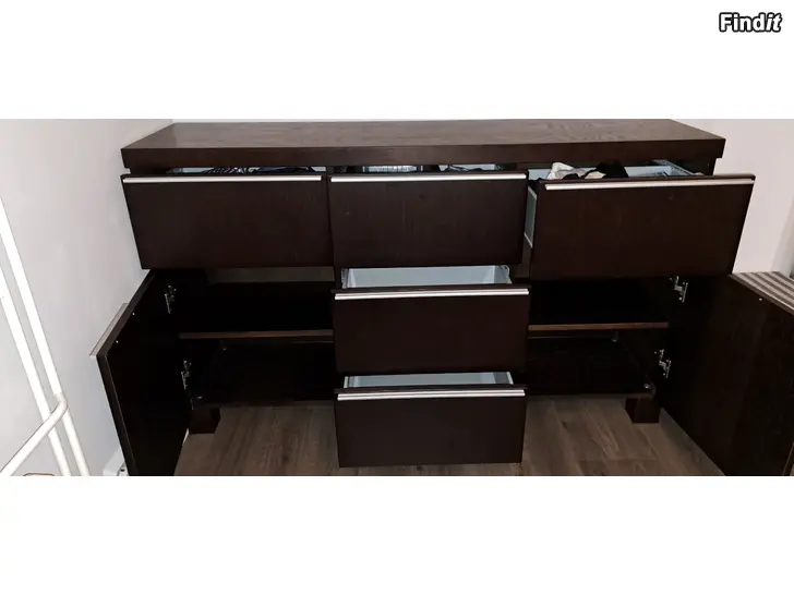 En svart-brun klädbyrå köpt från Vepsäläinen säljes pga utrymmesbrist. Bredd 153 höjd 92 och 40 djup. Fem stora metallådor som glider på felfria metallskenor. I de två små skåpen finns en justerbar hylla. Inga skråmor.