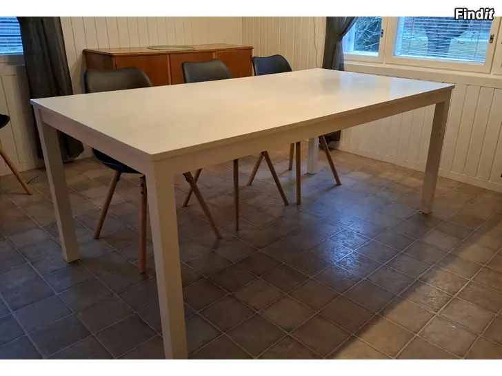 Säljes stabilt matbord, som blivit vit målad vid ett snickeri år 2013. Finns små spår av användning. Bredd 95, längd 180. Finns i Jeppo