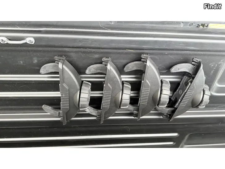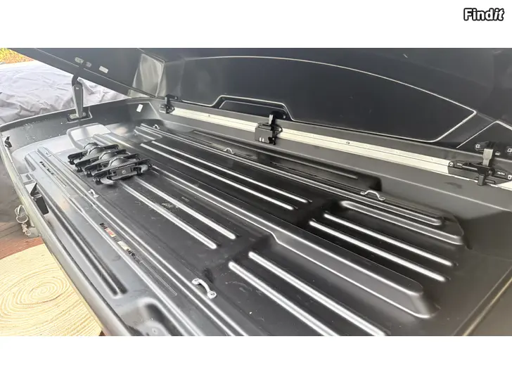 Största Thule skidboxen på marknaden. Använt fåtal gånger extra utrustning för skidor oanvända.Rymms upptill 7 par skidor Båda nycklarna finns och lås på båda sidorna kan öppnas båda riktningar. Fyra stycken Thule power klick snabbfäste nedkommer. Yttre mått 210 cm x 86 cm x 44 cm/ Inre mått 197 cm x 75 cm x 39 cm