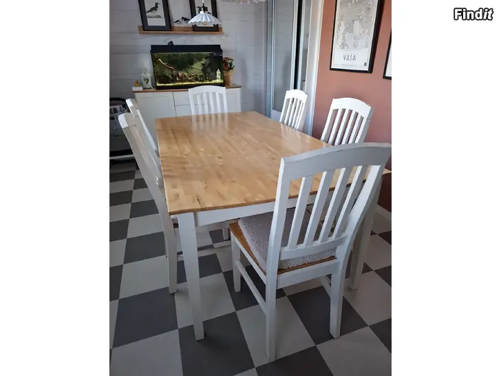 Bord och 6 stolar i fint skick. Bordsskivans mått 190x90 cm. Material: björk. Hämtas från Vasa centrum.