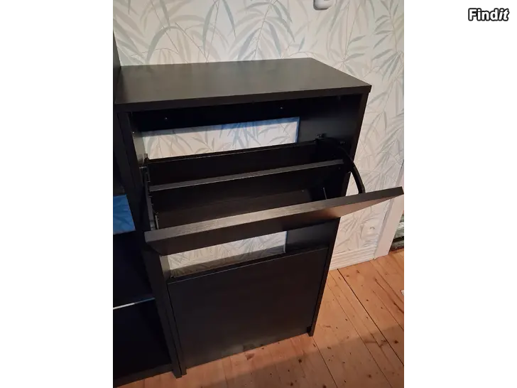 Ikea bokhylla. Bredd 80 cm. Höjd 203 cm..Djup 28 cm. 60 €. Skoskåp. Bredd 49 cm. Höjd 92,5 cm. Djup 28 cm. 25 €. Båda som nya. Båda delar tillsammans 70 €.