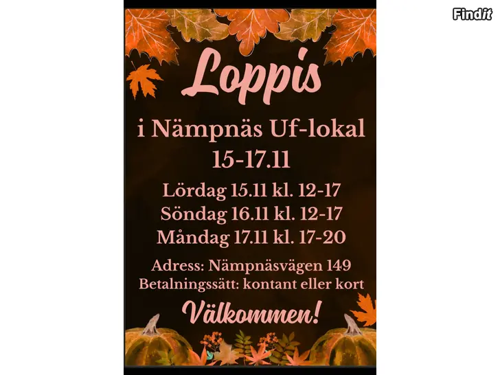 Välkommen inkommande helg till Närpes, Nämpnäs. Lördag kl 12-17, söndag kl 12-17 och måndag kl 17-20 är det loppis i uf lokalen i nämpnäs. Nämpnäsvägen 149 64510 Nämpnäs