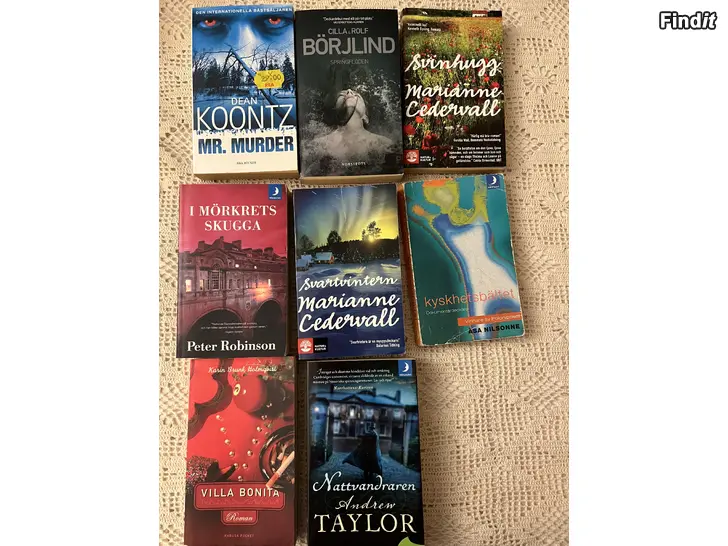 Mr. Murder av Dean Koonitz internationell bästsäljare spänningsroman Villa Bonita! Karin Brunk Holmqvist roman Nattvandraren Andrew Taylor deckare I mörkrets skugga Peter Robinson deckare Kyskhetsbältet Åsa Nilsonne vinnare av Polonipriset dokumentärdeckare Svartvintern Marianne Cederwall myspysdeckare