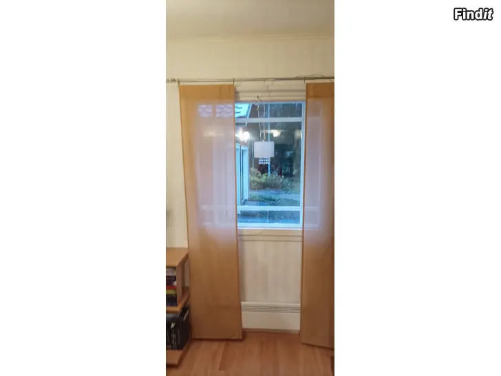 Två panelgardiner beige 2.05 och två beige mönstrade långgardiner 2.05 säljes som helhet.