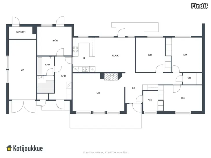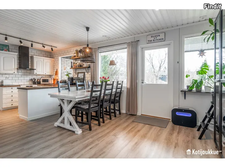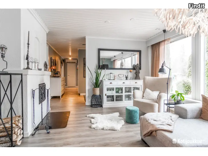 Köket och vardagsrummet är ljusa och utgör tillsammans hemmets hjärta. I hemmet finns tre sovrum och dessutom ett arbetsrum som lätt kan anpassas till ett fjärde sovrum, ett hobbyrum eller ett gemensamt lekrum för barnen – beroende på familjens behov. Familjens vardag underlättas av praktiska lösningar, såsom ett rymligt grovkök med egen utgång och passage till badrummet och bastun. De åtskilliga garderoberna och skåpen i hemmet möjliggör fungerande och trivsamt boende även för en större familj. 124/175m2.