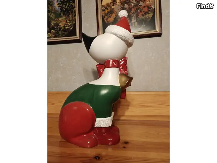 Figurinsbeskrivning: En sittande kattfigur med tomteluva.