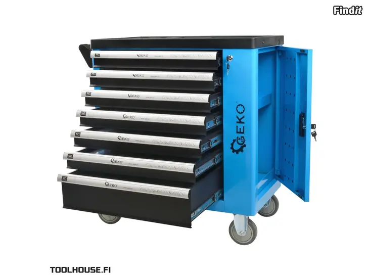 Verktygsvagn med sju lådor och ett skåp på gaveln av vagnen, sex av lådorna är fyllda med 243 st olika verktyg som täcker det största behovet i verkstaden.