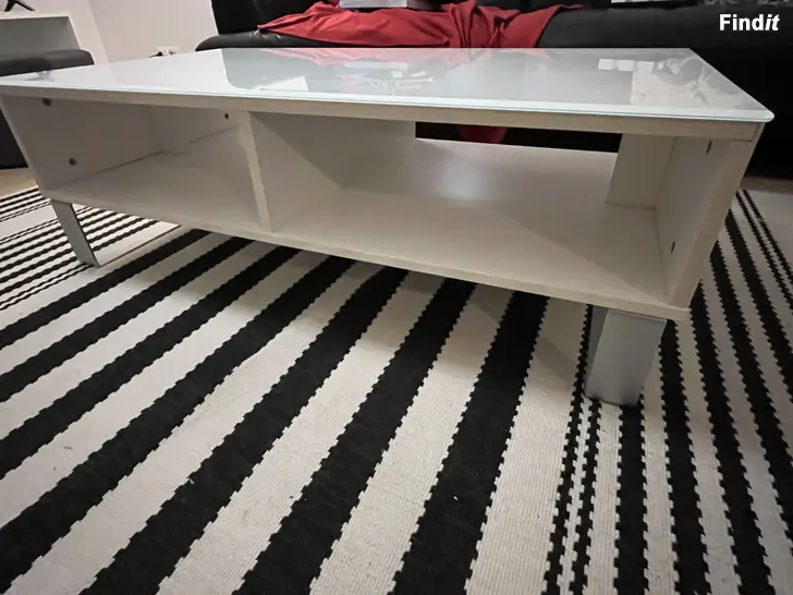 Vitt vardagsrumsbord med glasskiva och hyllplan under, stabilt och i gott skick. 110 x 60 cm. Höjd 36 cm.
