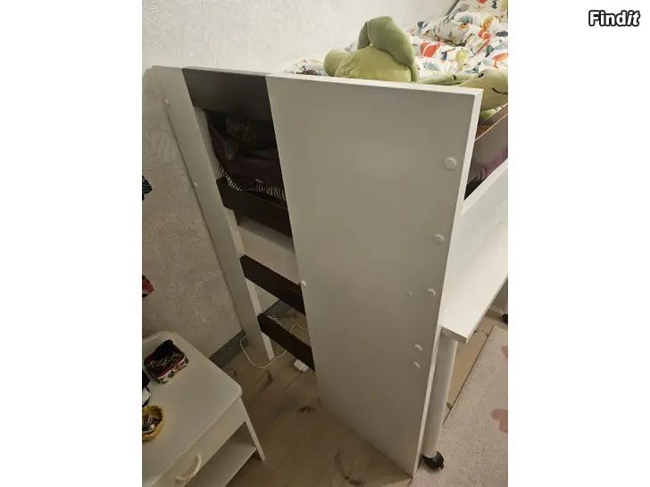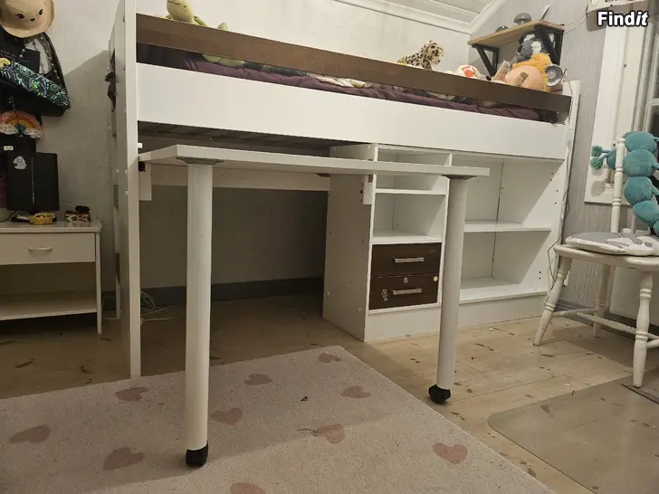 Säljes stabil kvalitets loftsäng med utdragbar skrivbordsyta. Förvaring i två djupa lådor samt ställbara hyllplan.