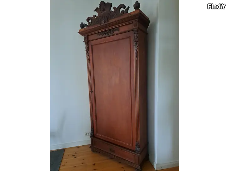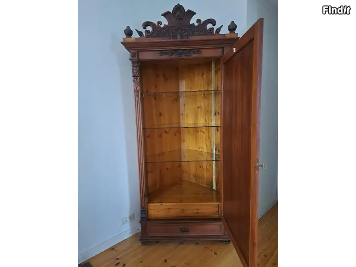 Ett stort och vackert antikt hörnskåp till salu. Skåpet är i fint skick med glashyllor som inte är original men som gör skåpet praktiskt, kan exempelvis användas som vitrinskåp för glas och tallrikar. Höjd 227cm, bredd 91cm, djup 71cm.