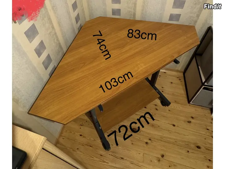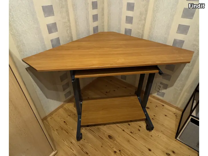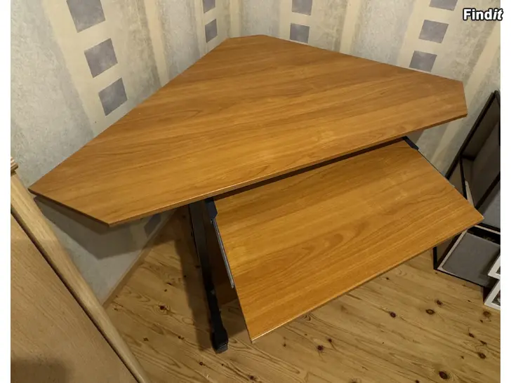 Skrivbord för dator i teak immitat. Hörnbord. Utdragbar skiva på skenor för tangentbord och mus. Nedre skiva för bordsdator. Väldigt användbart om man gillar upplägget. se bilder. Bordet är i bästa skick utan skråmor eller skador.