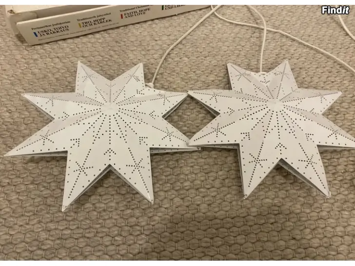 2 st vita julstjärnor i metall. I gott använt skick. Finns i Sundom. Skicka gärna sms eller epost.