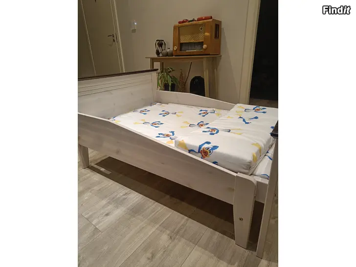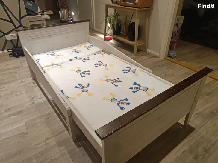 Utdragbar säng för barn säljes. Madrass + förlängningsdel fås med, mått 116x75 + 36cm. Spår av användning finns men stadig och bra. Hämtas från Kvevlax.