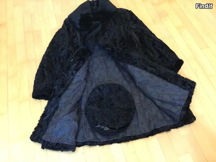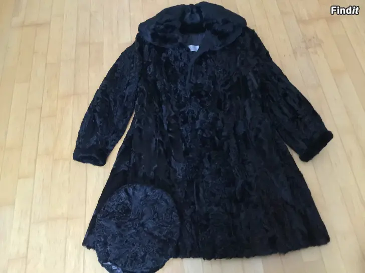 Krimpäls med tillhörande huvudbonad, ca stl 40. Oanvänd. Atelje’sydd 90-talet, Fashion & Design B. MInor Finland. Förstklassigt skick.