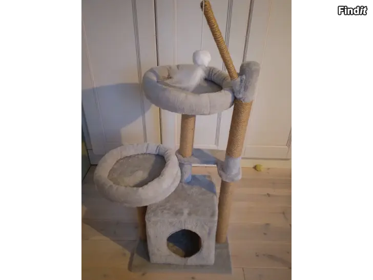 Sysselsätter katten och har mjuka avsatser att ligga på, och ett mysigt hus. Fyra stolpar där katten kan sköta sina klor.