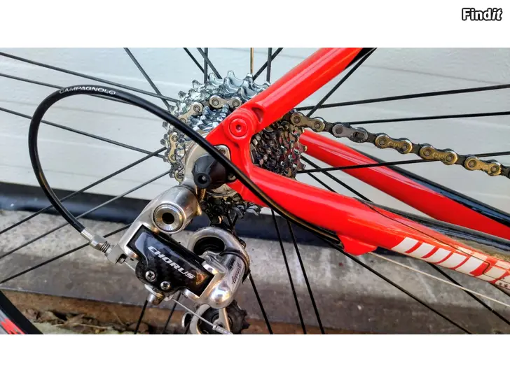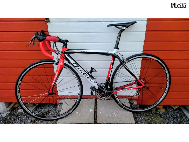 Väldigt välhållen carbon racer, en Wilier Izoard som jag köpte ny från Mysports 2012. Storleken är S 52, passar bra för +/- 1,75 lång person. Min fru cyklade med den utomhus de första två åren, från 2014 har den sen funnits på trainer i vårt hemmagym, där hon ibland cyklat med den under vinterhalvåret. Campagnolo växlar 2x10, Chorus bak/fram. Cykeln väger in på lätta 7,7 kg.