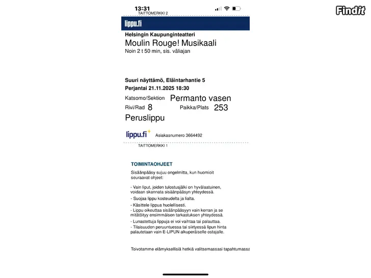 2 biljetter till musikalen Moulin Rogue 21.11 klockan 18.30 på Helsingfors Stadsteater säljes. Biljetterna är i elektroniskt format. Platserna är bredvid varandra.