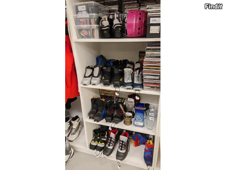 Monon för barn, SNS och NNN bindning. pris 10-30 euro. Jofa hjälmar, 49-56 cm ställbara. XS-M..pris 8-8,50 euro st. Comboliina loppis hylla 161 och 163, Vasa