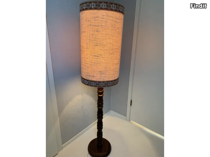 Retro golvlampa i nyskick med tygskärm. Lampans totala höjd 127 cm, skärmens höjd 54 cm. Lampan ger ett mjukt, behagligt varmt sken. Pris 20 €, hämtas från Kvevlax.
