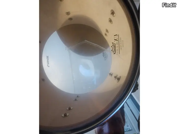 Sonor trummor, trumpinnar och stol. Ena plasten på undersidan är lite trasig men annars komplett set. Kostar några euro att byta men fungerar bra sådär också för nybörjare.
