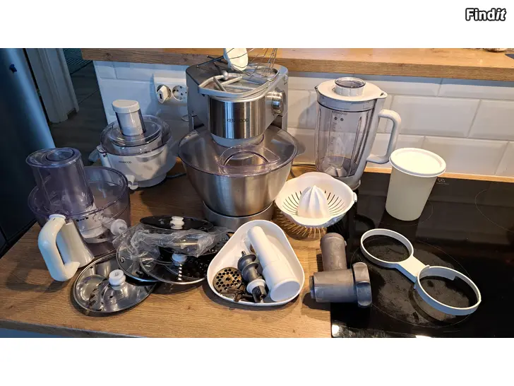 Säljes Kenwood köksassistent med många tillbehör. Degkrok, visplar, köttkvarn, mixer, blender, rivjärn, saftpress.