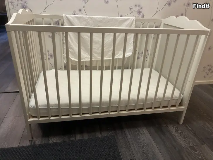 Vi säljer vår sons gamla spjälsäng eftersom han har växt ur den . Madrassdelen är höj och sänkbar och kan skruvas bort och skruva tillbaka med verktyg. Stänkskydd till madrassen ingår . Finns i Kvevlax att hämtas.