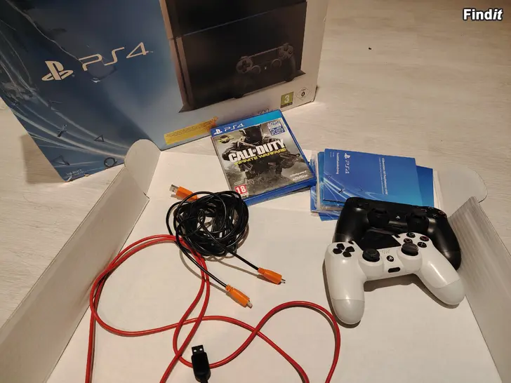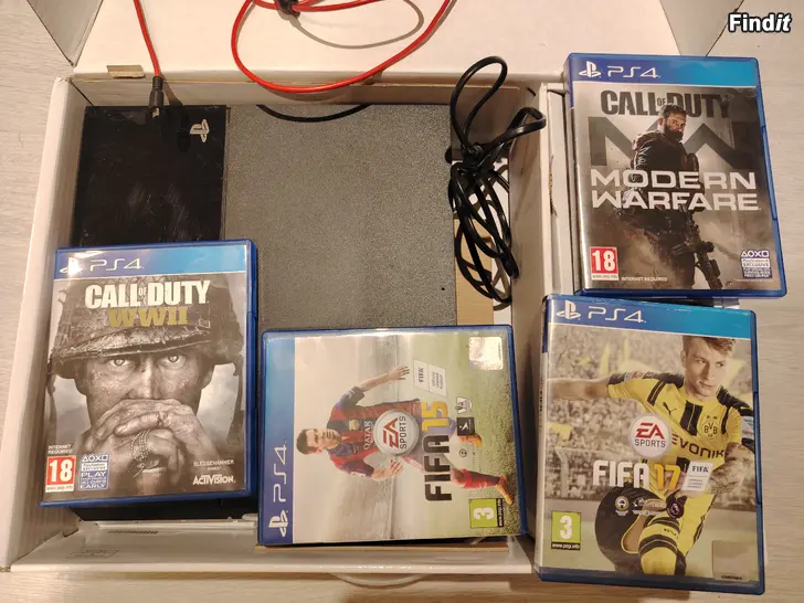 Fungerande PS4, med 2 kontroller och 5 spel: Call of duty WWII, Call of duty infinte warfare, Call of duty modern warfare, Fifa 15 och Fifa 17. Instruktionsmanualer och sliten original förpackning.
