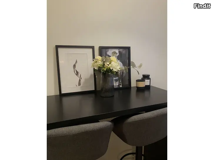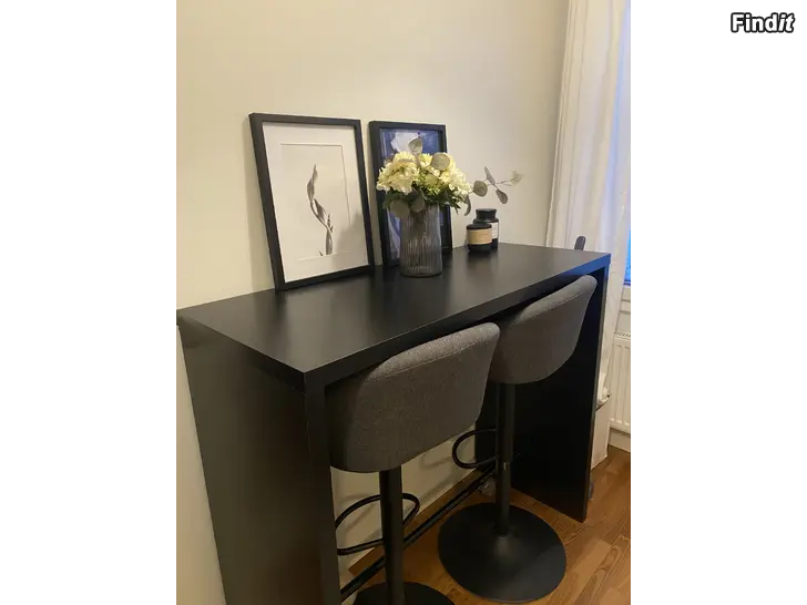 Barbord från Jysk 50x120, och 4 stycken stolar endast två syns på bild men alla är likadana som är justerbara i höjden. Bordet är i bra skick små skavanker finns men inte något som stör. Av vad jag har märkt så kan ena stolen sjunka av sig själv då man sitter på den, men inga andra problem har framkommit. Skicka meddelande vid intresse!