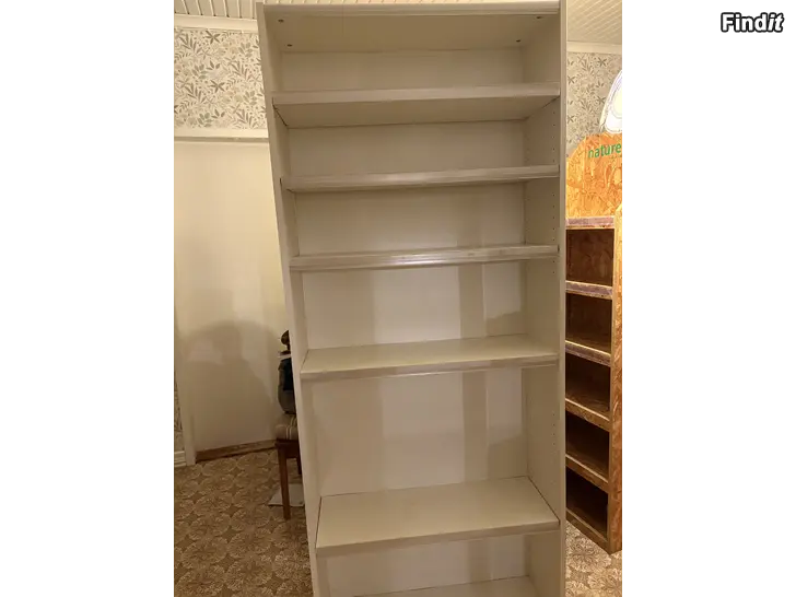 Brun hylla som är 201x90 cm,endast 25 € och en vit Ikeas Billy hylla 25€