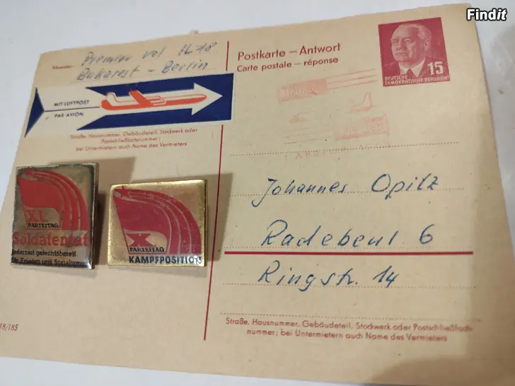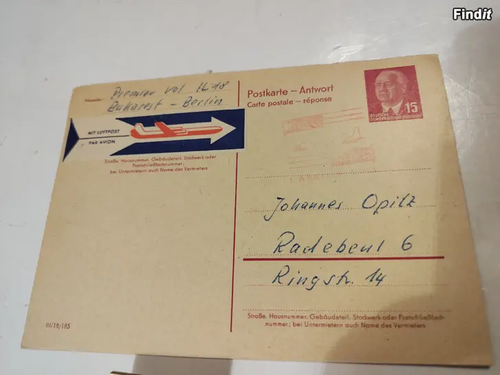 Lisäksi Lufthansan 15 Pfennigin ensilento vastausehiökortti Bukarest - Berlin.