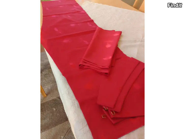 2 st gardinskappor 140 x 35 och 4 st tillhörande omtag. Julröd färg, välsydda, kvalitetstyg. Tänkta att användas med t ex långa, vita sidogardiner. Helt oanvända pga flytt. Pris för allt 20 €