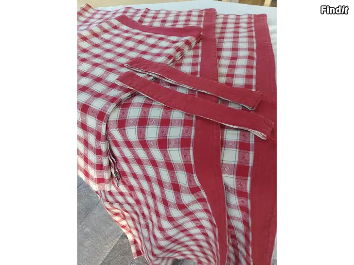 2 st sidogardiner 150 långa och 120 breda med 2 omtag samt en gardinskappa 150 lång och 75 cm hög. Allt i stadigt bomullstyg. Använda ett par jular, men felfria och nytvättade. Pris 20 €.