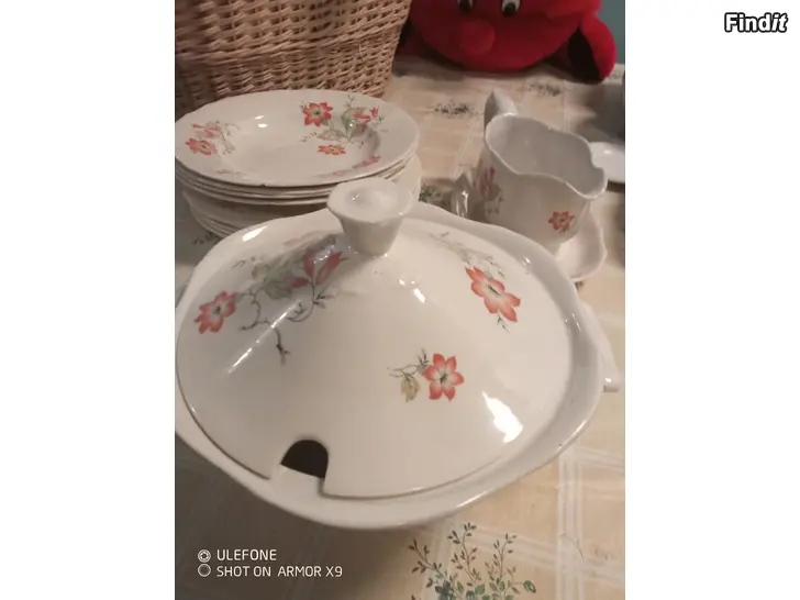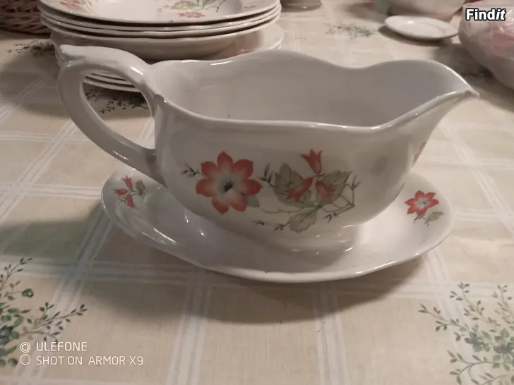 Karott, en såsbehållare, fyra djupa tallrikar samt fem flata. Små skador på två av djupa tallrikarna och på såsbehållaren. Syns på foto.
