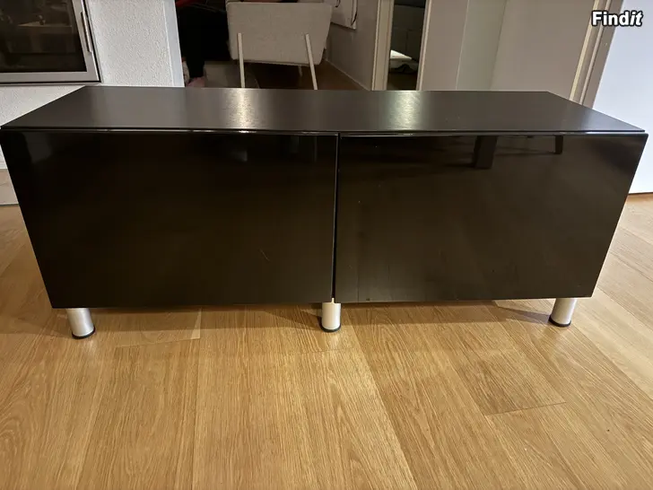 2st IKEA Bestå TV-bänkar i svart med högblank front. Längd 120cm, höjd 49cm, djup 41cm