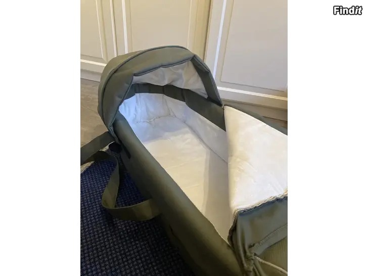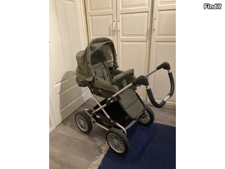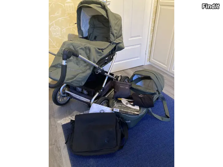 Fin mossgrön barnvagn med tillhörande liggdel säljes. Använd av 1 barn. Har förvarats inomhus. Med på köpet fås regnskydd, myggnät och solskydd + skötväska med tillhörande skötunderlag.