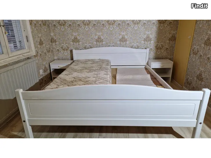 Vit träsäng med två sängbord. En madrass fås med om man vill. Finns i Jeppo.
