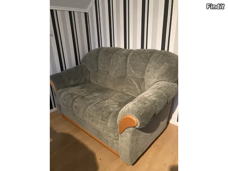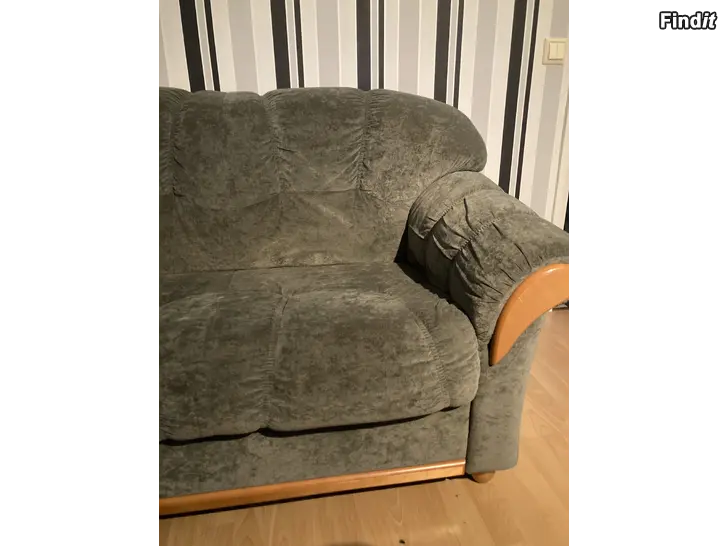 Säljer en bekväm soffa f Pohjanmaan Kaluste. Dov grönfärg, plyschaktigt tyg. Har trädetaljer i lackad björk.