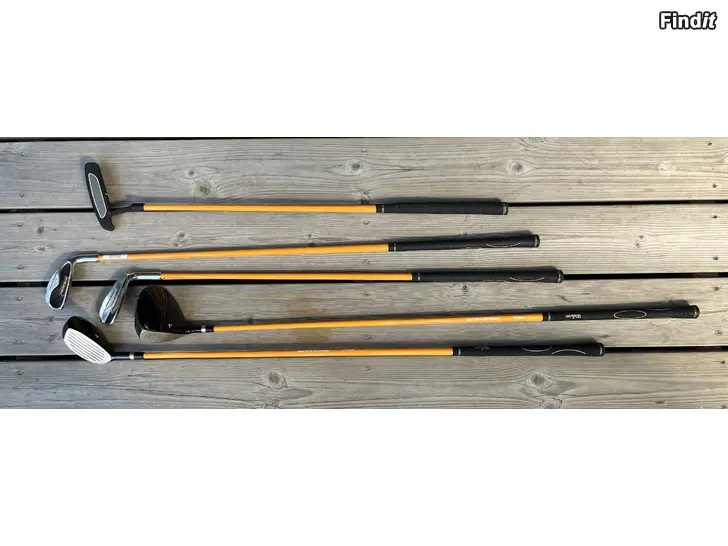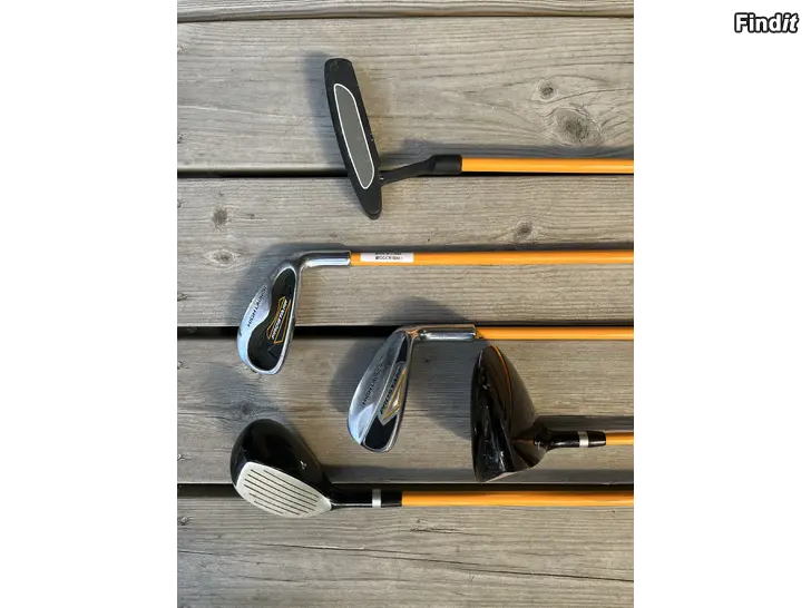 Wilson golfset för 127-142 cm långt barn. Allt i princip i nyskick. Två träklubbor, två järnklubbor och en putter. Bärbar bag med infällbara stödben och bra fickor.