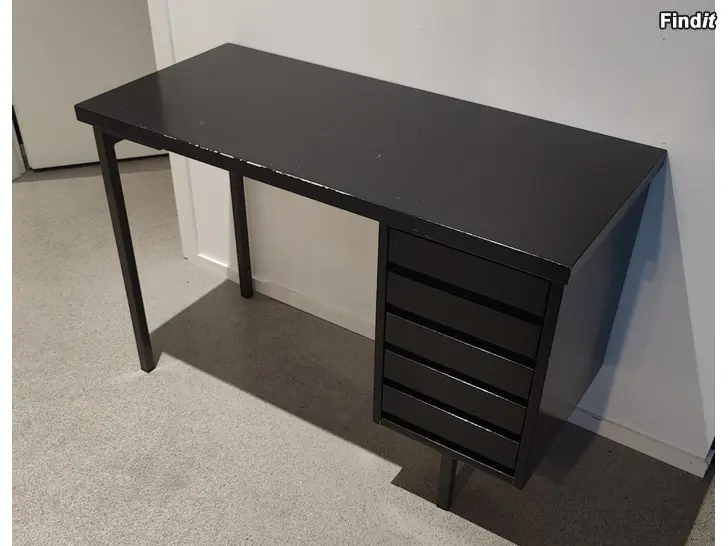 Svartmålat litet retroskrivbord med utdragbara lådor. Längd 100 cm, djup 45 cm, höjd 67,5 cm. Spår av användning syns på bilden. Hämtas i Jakobstad.