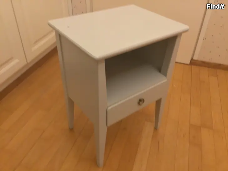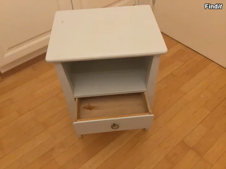 Ett fint sängbord från början av 50-talet i björk. 33 x 42 samt höjd 57.En draglåda med handtag i mässing. Bra skick, målad i pärlgrått.